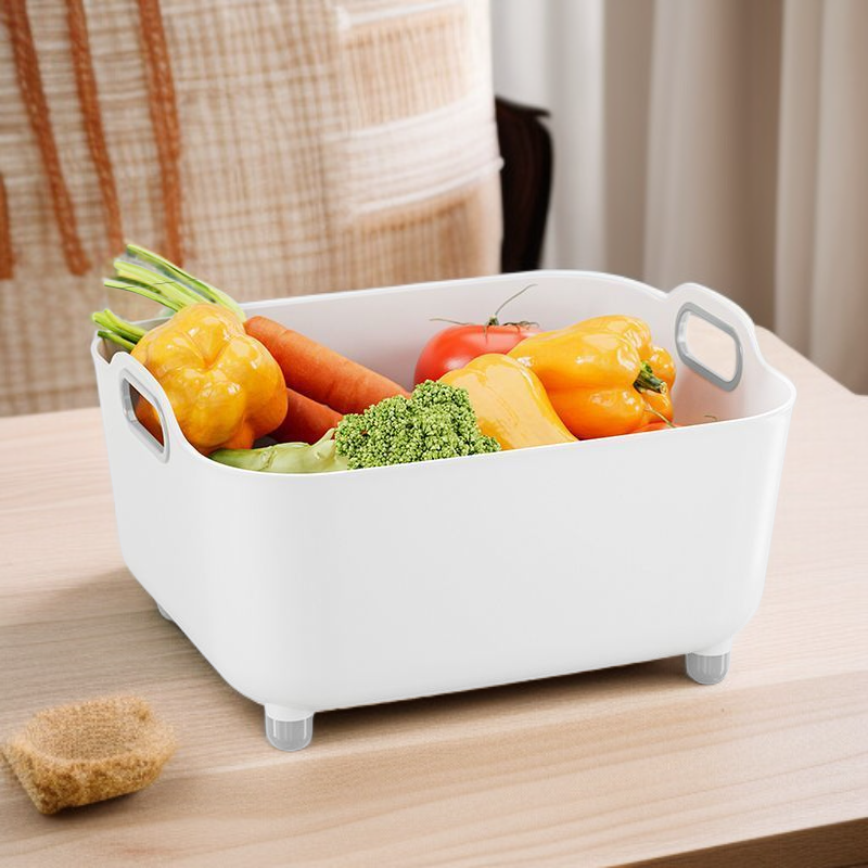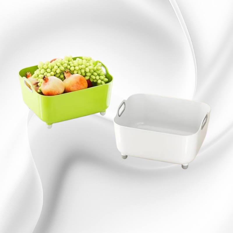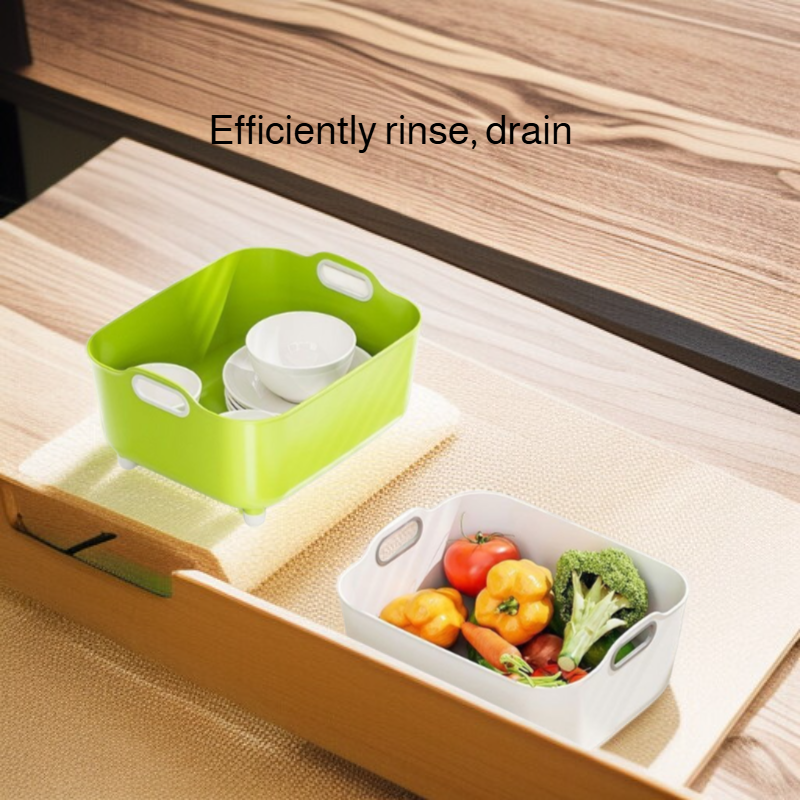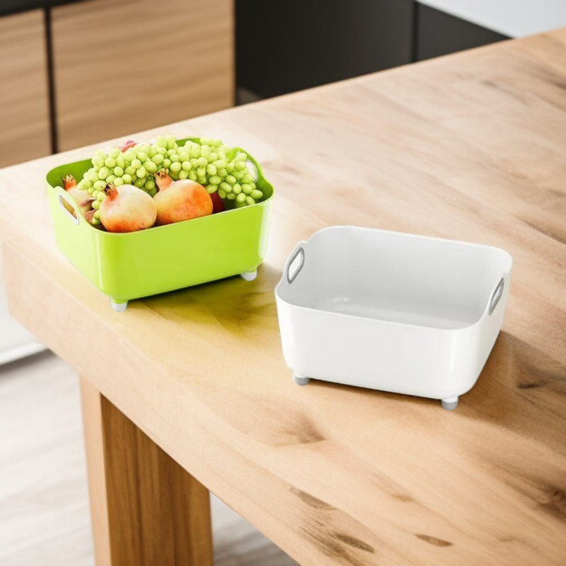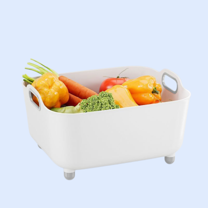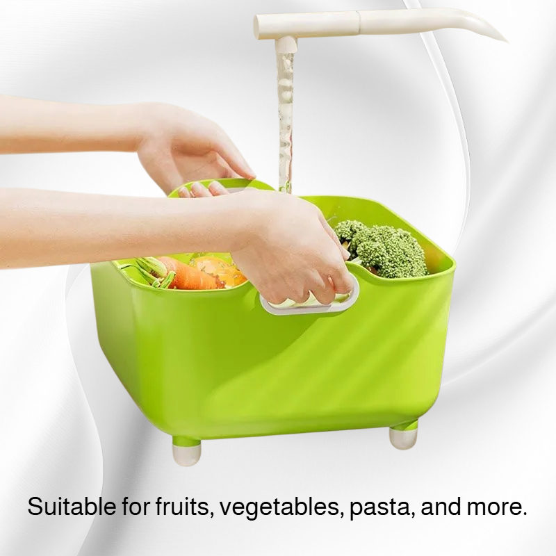 Multifunctional design for rinsing, draining, and mixing; easy-to-move bowl; durable material; space-saving for any kitchen; suitable for fruits, vegetables, pasta, and more.