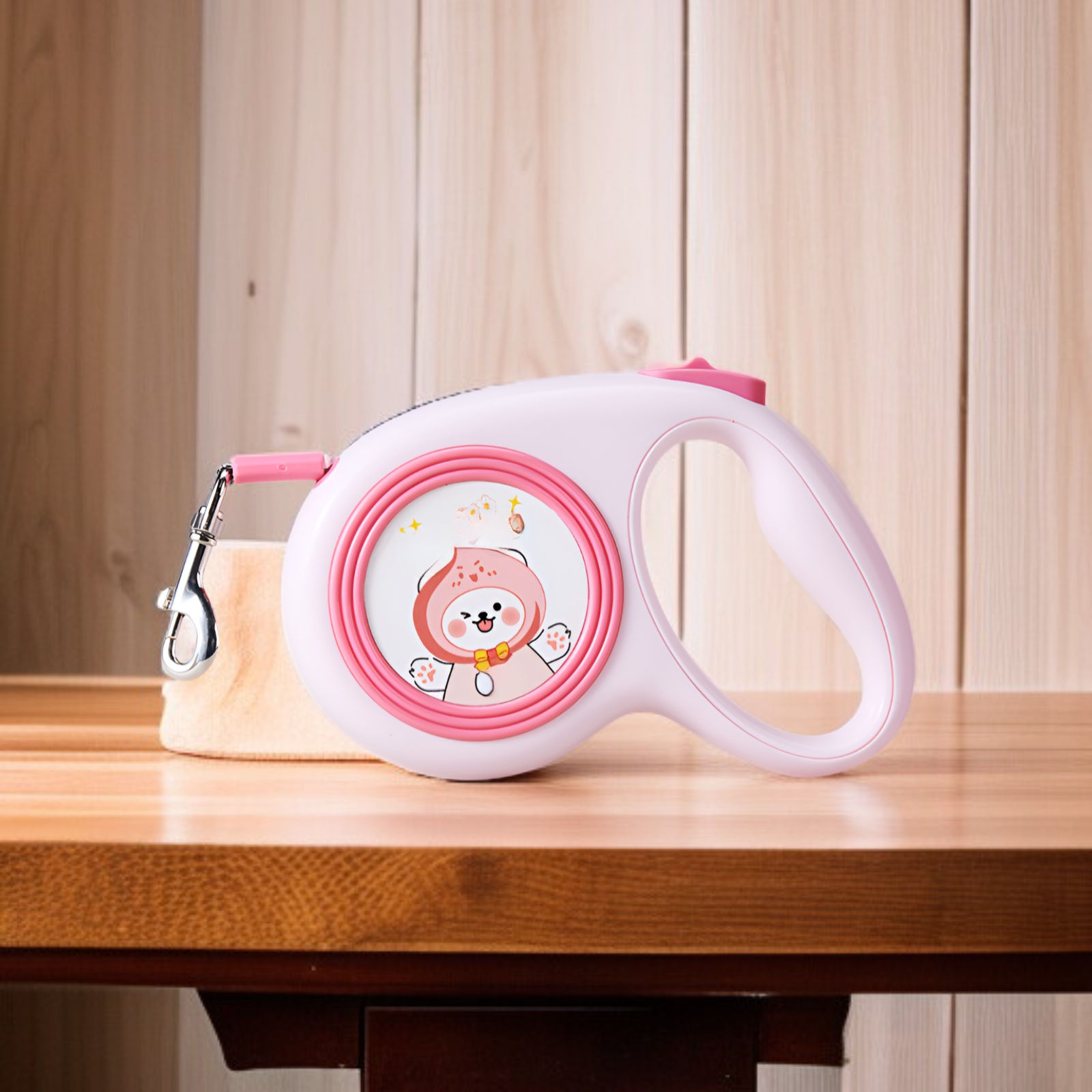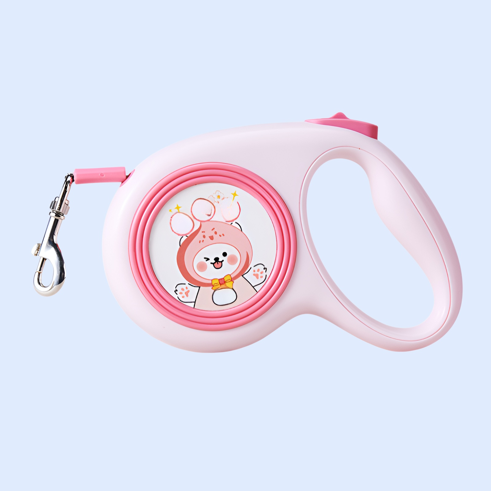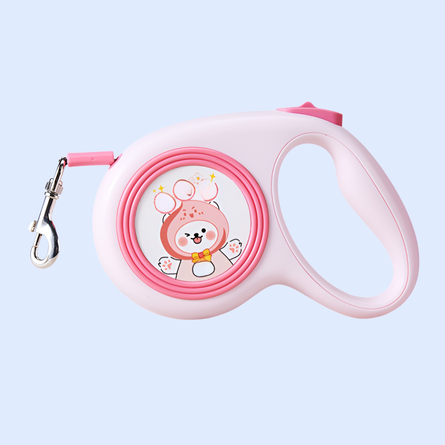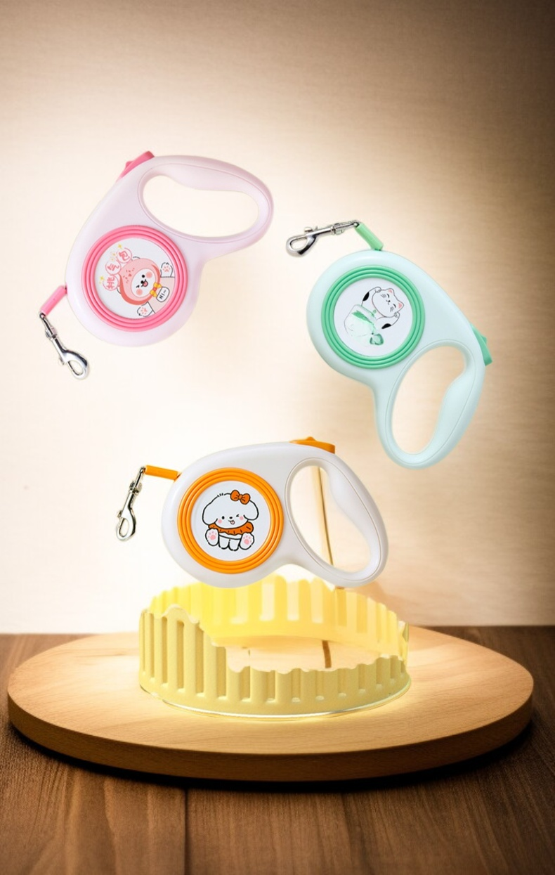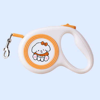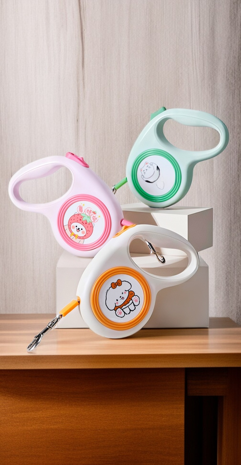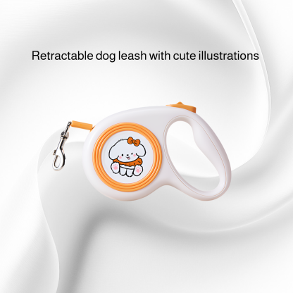 Retractable dog leash with cute illustrations, durable design, smooth retraction, comfortable grip, suitable for small and medium dogs, tangle-free, easy to use.